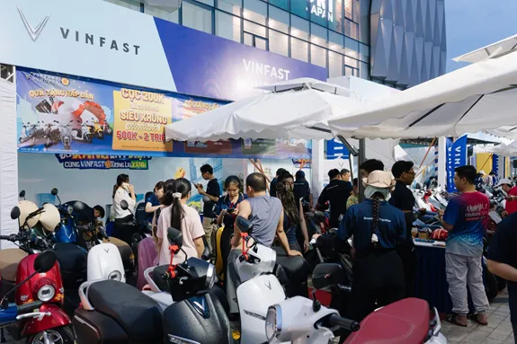 Tại điểm cầu TP Hồ Chí Minh, không khí bắt đầu nhộn nhịp từ sáng sớm ngày 2/8. Như thường lệ, khu vực tập trung đông người nhất tại sự kiện vẫn là gian hàng của các đại lý, nơi khách hàng có thể tìm hiểu về các mẫu xe và quy trình chuyển đổi. Các mẫu xe thu hút sự chú ý của khách hàng có thể kể đến VinFast Motio, Evo Neo, Feliz Neo, Vento Neo…