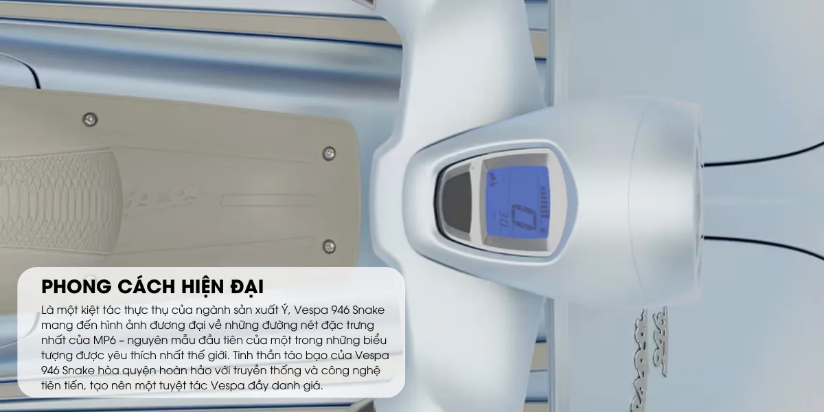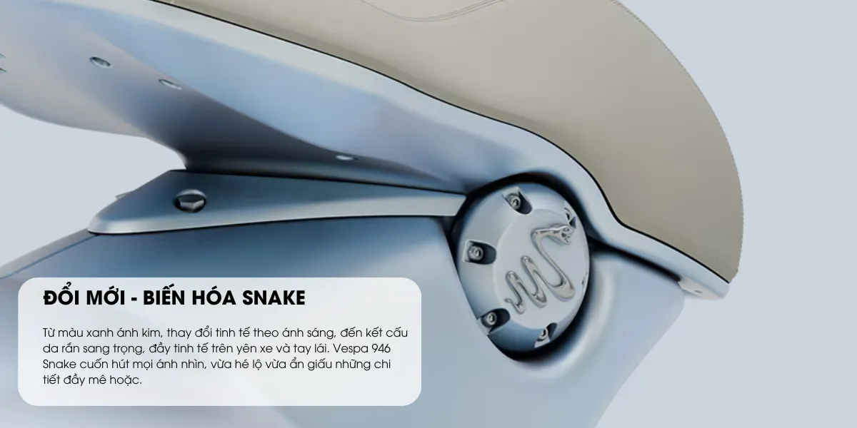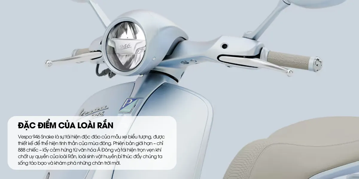 Trong năm Ất Tỵ, Vespa 946 Snake ra đời: một phiên bản giới hạn, kết tinh giữa sự chế tác tinh xảo và thiết kế Ý đẳng cấp. Sự giao thoa giữa lịch sử và huyền thoại, nơi tinh thần nổi loạn và vẻ đẹp vượt thời gian của Vespa hòa quyện cùng tinh thần đương đại và sự cuốn hút đầy tinh tế của loài Rắn. Một lời mời đầy táo bạo để vượt qua mọi giới hạn, sống trọn vẹn và khám phá thế giới không biên giới.